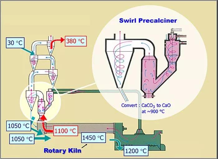 • 生料粉在旋風(fēng)預(yù)熱器系統(tǒng)中與高溫?zé)釟庠趹腋顟B(tài)下進(jìn)行熱交換。