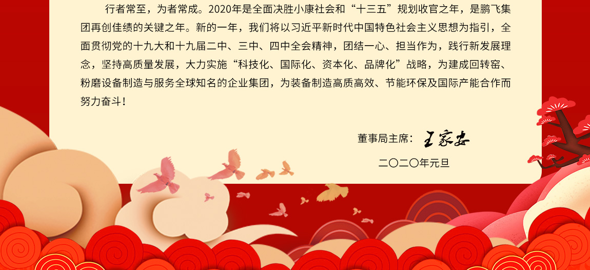 行者常至,為者常成。2020年是全面決勝小康社會和“十三五”規(guī)劃收官之年,是鵬飛集團(tuán)再創(chuàng)佳績的關(guān)鍵之年。新的一年,我們將以習(xí)近平新時代中國特色社會主義思想為指引,全面貫徹黨的十九大和十九屆二中、三中、四中全會精神,團(tuán)結(jié)一心、擔(dān)當(dāng)作為,踐行新發(fā)展理念,堅持高質(zhì)量發(fā)展,大力實施“科技化、國際化、資本化、品牌化”戰(zhàn)略,為建成回轉(zhuǎn)窯、粉磨設(shè)備制造與服務(wù)全球知名的企業(yè)集團(tuán),為裝備制造高質(zhì)高效、節(jié)能環(huán)保及國際產(chǎn)能合作而努力奮斗!