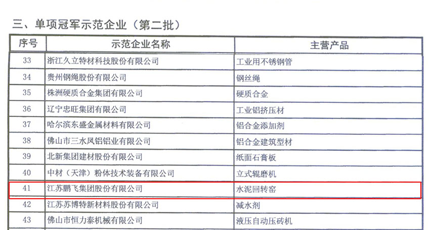 江蘇鵬飛集團(tuán)股份有限公司榮獲國(guó)家制造業(yè)單項(xiàng)冠軍示范企業(yè)稱號(hào),憑借的是主營(yíng)產(chǎn)品水泥回轉(zhuǎn)窯的雄厚制造實(shí)力。