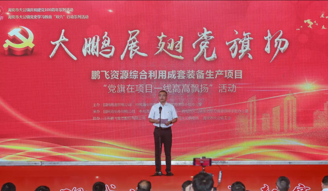 “今天活動現(xiàn)場的‘鵬飛資源綜合利用成套裝備生產項目’是2021年江蘇省重大項目,南通市‘黨旗在項目一線高高飄揚’活動第一批啟動項目。為了著力提升服務效能,健全重大項目服務機制,大公鎮(zhèn)牽頭組織成立項目臨時黨支部、項目服務專班,一刻不停推項目,讓黨旗飄揚在項目一線;一著不讓抓發(fā)展,讓黨員沖鋒在項目一線;一以貫之優(yōu)環(huán)境,讓服務下沉到項目一線,著力辦實事、解難題,為推進重大項目建設提供有力支撐和堅實保障。”大公鎮(zhèn)黨委書記金山存說。
