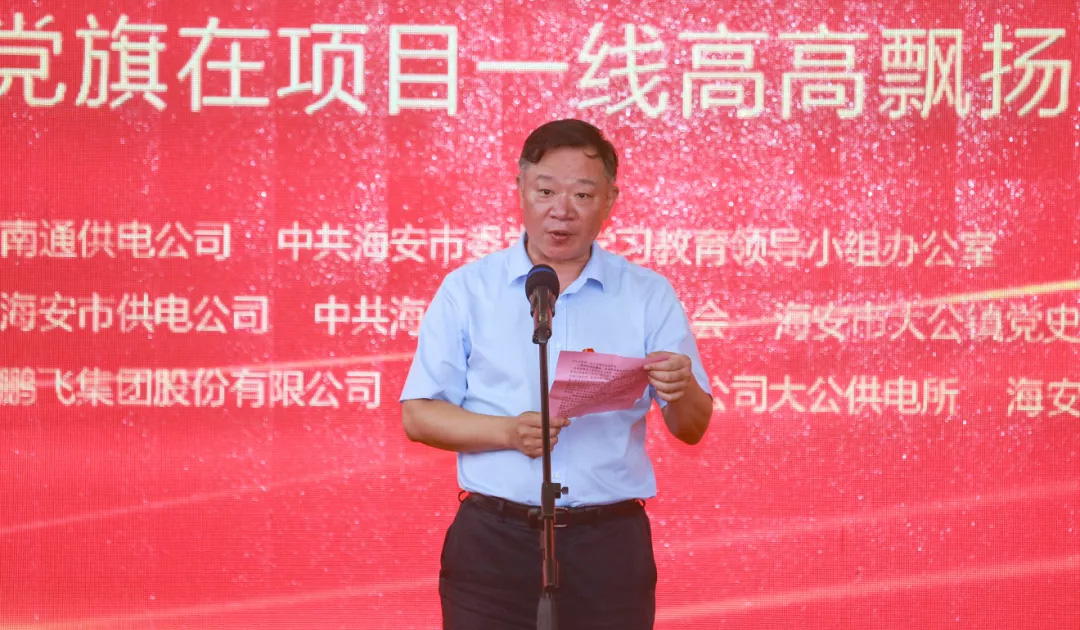 國網南通供電公司副總經理李秋實,海安市委常委、宣傳部部長王榮貴,海安市委組織部副部長、“兩新”工委書記吳蘭,海安市委宣傳部常務副部長劉萬春,海安市委宣傳部副部長、新聞出版局局長陳琳,國網海安市供電公司總經理唐玉婷,海安市發(fā)改委黨組成員、工信局專職副局長陳皞,鵬飛集團黨委書記、董事長王家安,大公鎮(zhèn)黨委書記金山存,大公鎮(zhèn)黨委副書記、鎮(zhèn)長魯競共同啟動“黨旗在項目一線高高飄揚”活動。
