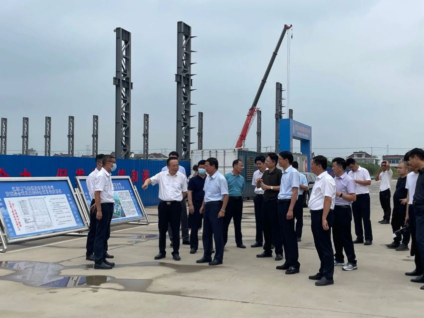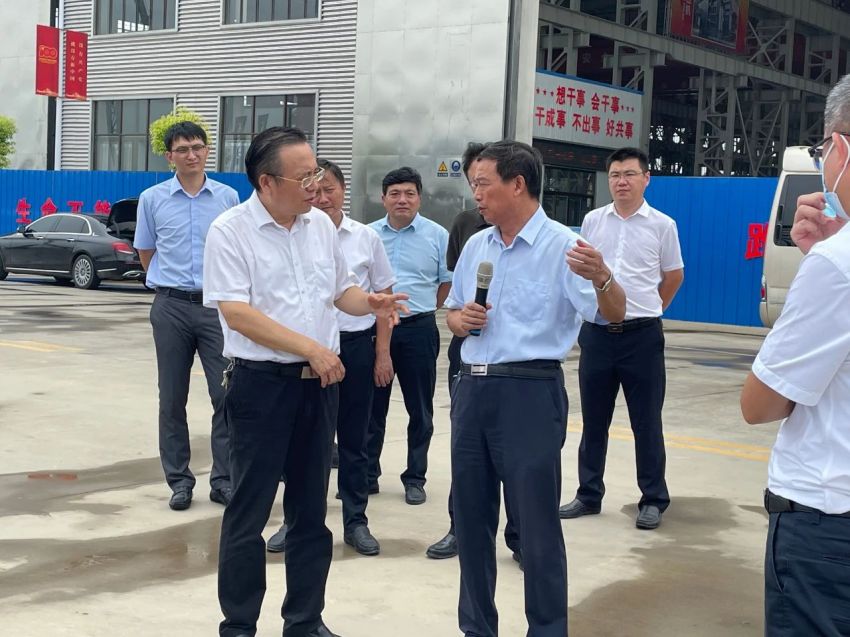 江蘇鵬飛集團(tuán)股份有限公司資源綜合利用成套裝備生產(chǎn)項(xiàng)目現(xiàn)場(chǎng),黃衛(wèi)成聽取了公司董事長王家安關(guān)于資源綜合利用成套裝備生產(chǎn)項(xiàng)目的投資規(guī)模、用地面積、建筑面積、建設(shè)進(jìn)度等情況的介紹。此外,他還就項(xiàng)目建設(shè)的手續(xù)審批、大件產(chǎn)品的運(yùn)輸、疫情對(duì)公司產(chǎn)品出口造成的影響等問題與王家安進(jìn)行交流。