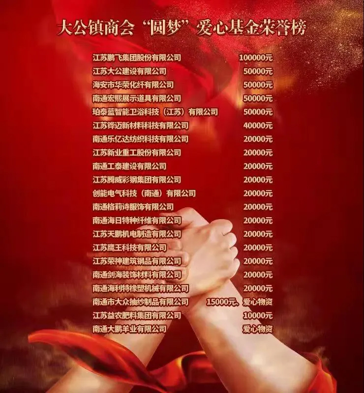 海安市政協(xié)副主席、市工商聯(lián)主席蔡祝平,大公商會會長、鵬飛集團(tuán)董事長王家安共同為愛心基金揭牌,宣布大公鎮(zhèn)商會“圓夢”愛心基金正式成立!前期,大公鎮(zhèn)商會21家副會長單位共計(jì)籌集60.5萬元愛心善款,所募集資金主要用于:幫助困境青少年、開展青少年公益實(shí)踐等活動(dòng)。