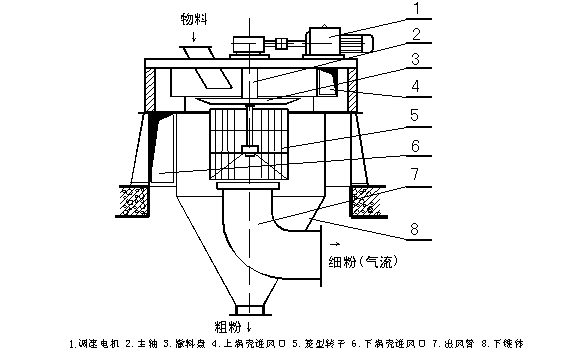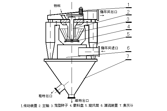 由傳動裝置、回轉(zhuǎn)部分(主軸、撒料盤、轉(zhuǎn)子等),機殼(內(nèi)筒、導向葉片、內(nèi)錐體、外筒、外錐體、進風口、加料口、兩個粗粉出口等),細粉收集裝置(四個旋風筒等)組成。