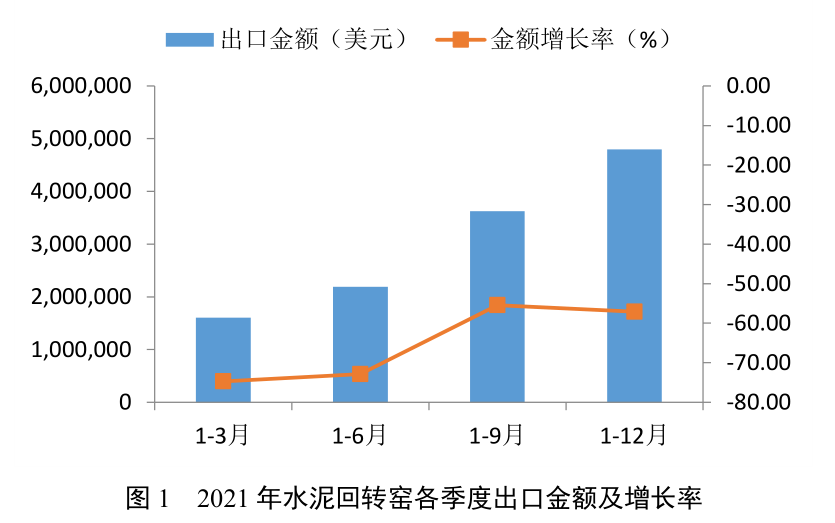 表1 2021年水泥回轉(zhuǎn)窯出口數(shù)量、金額及增長率