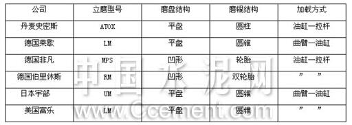 就當(dāng)前而言,立磨、輥壓機(jī)、筒輥磨三種料床粉磨設(shè)備都可以用于水泥及礦渣微粉的終粉磨?,F(xiàn)以立磨為例,世界各知名公司的立磨都有其自主知識產(chǎn)權(quán),磨機(jī)內(nèi)部結(jié)構(gòu)不盡相同、各有千秋。國外立磨結(jié)構(gòu)形式見表2: