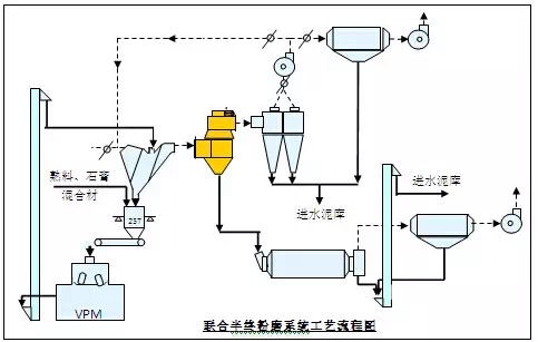此工藝運用于VPM立磨功率與球磨機(jī)功率比值大于0.5的場合,該系統(tǒng)主要優(yōu)點是系統(tǒng)產(chǎn)量高(增產(chǎn)100%以上),單位電耗低。