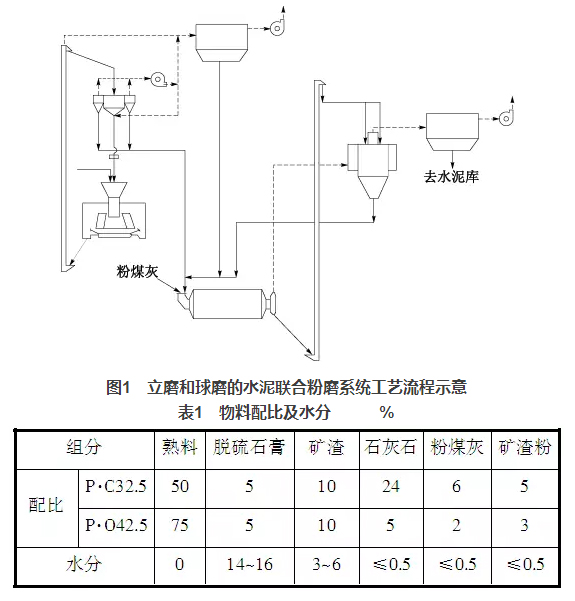 淶水冀東水泥有限公司3個水泥粉磨系統(tǒng)均采用JLMS-24.3立磨與Φ4.8m×9.5m球磨機組成聯(lián)合粉磨系統(tǒng)。JLMS-24.3立磨裝機功率2240kW,磨盤中徑2400mm,3個磨輥,磨盤轉(zhuǎn)速33.58r/min,產(chǎn)量210t/h,入料粒度≤30mm;配套選粉機JXF4100GY,成品量180~220t/h,比表面積≥200m2/kg,最大喂料量600t/h,通過氣體溫度≤150℃,通風量(70~90℃)180000m3/h;球磨機Φ4.8m×9.5m,裝機功率3550kW,產(chǎn)量180t/h,生產(chǎn)P·O42.5水泥時,比表面積360~380 m2/kg;配套O-Sepa選粉機,通風量240000m3/h,最大通過量720t/h。水泥粉磨系統(tǒng)工藝流程見圖1,系統(tǒng)設(shè)計指標:生產(chǎn)P·O42.5水泥,臺時產(chǎn)量180t/h,分步電耗35.5kWh/t,比表面積360m2/kg,生產(chǎn)P·C32.5水泥,臺時產(chǎn)量240t/h,分步電耗26.6kWh/t,比表面積370m2/kg。物料配比及相應的水分情況見表1。