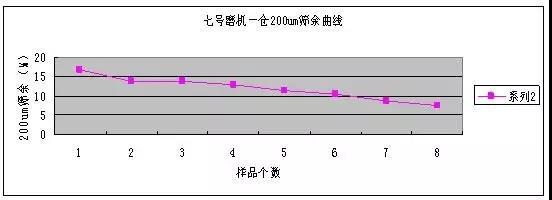 (1)從以上的兩個(gè)趨勢(shì)圖可以看出七號(hào)磨機(jī)的一倉(cāng)粉磨能力還可以,特別是200um的篩余趨勢(shì)圖,篩余下降明顯。說(shuō)明一倉(cāng)鋼球級(jí)配和理粉磨能力正常。
