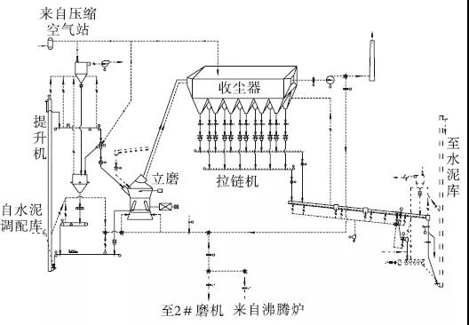 生產(chǎn)P·O42.5水泥時(shí)工藝流程是:熟料、石膏、石灰石、粉煤灰、礦渣等物料經(jīng)輸送設(shè)備輸送至各配料倉,粉煤灰從粉煤灰?guī)煜陆?jīng)輸送設(shè)備進(jìn)入生產(chǎn)系統(tǒng)。各種物料按一定比例設(shè)定,分別經(jīng)各定量給料機(jī)和輸送設(shè)備送至入磨鎖風(fēng)閥后入磨。入磨物料在磨內(nèi)進(jìn)行烘干和粉磨,粉磨后的物料經(jīng)選粉機(jī)分離,粗粉返回磨盤重新粉磨,合格細(xì)粉隨氣流直接進(jìn)入袋式收塵器進(jìn)行收集,收集下來的成品經(jīng)空氣斜槽、斗式提升機(jī)等輸送設(shè)備入水泥庫儲(chǔ)存;立磨吐渣經(jīng)輸送設(shè)備(設(shè)有除鐵器)進(jìn)入循環(huán)斗式提升機(jī),提升入磨后繼續(xù)粉磨。沸騰爐提供的熱風(fēng)與循環(huán)風(fēng)、冷風(fēng)混合后進(jìn)入磨內(nèi),磨內(nèi)混合風(fēng)起到烘干和提升物料的作用,出磨氣流進(jìn)入布袋收塵器;出布袋收塵器的氣體經(jīng)循環(huán)風(fēng)機(jī)后一部分經(jīng)循環(huán)風(fēng)管,作為循環(huán)風(fēng)入磨,其余氣體經(jīng)煙囪排入大氣。系統(tǒng)工藝流程見圖1。