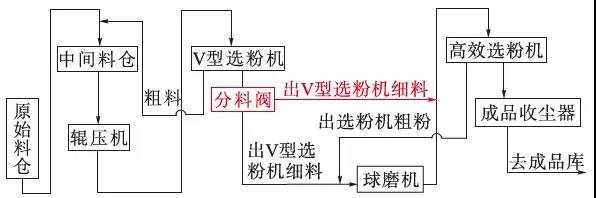 2 粉磨流程改進我們在出V型選粉機與入磨溜子之間安裝可調(diào)節(jié)翻板式分料閥(以下簡稱分料閥),該分料閥可將物料分為兩路,一路入磨機,另一路經(jīng)空氣輸送斜槽入高效選粉機,同時,該分料閥還可進行10格調(diào)節(jié)(0%~100%)。試驗前后工藝流程簡圖及照片分別見圖1~圖3。