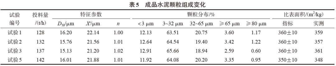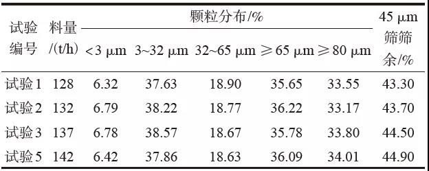 關(guān)閉和開啟不同格數(shù)的分料閥進行生產(chǎn),分別標(biāo)定磨機產(chǎn)量,并對粉磨過程中各點物料進行取樣,測定物料顆粒組成及物理性能、與外加劑相容性。然后對加工過程中各點物料粒度變化情況進行比較后進行質(zhì)量指標(biāo)的調(diào)整(試驗5)。