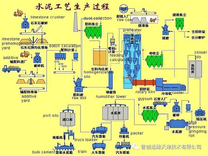 4.生產(chǎn)工藝:硅酸鹽水泥生產(chǎn)的大體步驟是:先把幾種原材料按適當(dāng)?shù)谋壤浜虾煤笤谀C(jī)中磨成生料;然后將制得的生料入窯進(jìn)行煅燒;再把燒好的熟料配以適當(dāng)?shù)氖啵ê突旌喜牧希┰谀C(jī)中磨成細(xì)粉,即得水泥。硅酸鹽系水泥的生產(chǎn)概括起來就是“兩磨一燒”。生料制備:石灰質(zhì)原料,粘土質(zhì)原料與少量校正原料經(jīng)破碎后,按一定比例配合、磨細(xì),并配合為成分合適,質(zhì)量均勻的生料熟料煅燒:生料在水泥窯內(nèi)煅燒至部分熔融所得以硅酸鈣為主要成分的硅酸鹽水泥熟料水泥粉磨:熟料加適量石膏,有時還加適量混合材料或外加劑共同磨細(xì)為水泥生產(chǎn)方法①干法生產(chǎn) 將原料同時烘干并粉磨,或先烘干經(jīng)粉磨成生料粉后喂入干法窯內(nèi)煅燒成熟料的方法。但也有將生料粉加入適量水制成生料球,送入立波爾窯內(nèi)煅燒成熟料的方法,稱之為半干法,仍屬干法生產(chǎn)之一種。②濕法生產(chǎn) 將原料加水粉磨成生料漿后,喂入濕法窯煅燒成熟料的方法。也有將濕法制備的生料漿脫水后,制成生料塊入窯煅燒成熟料的方法,稱為半濕法,仍屬濕法生產(chǎn)之一種。 干法和濕法生產(chǎn)特點(diǎn)①干法生產(chǎn)特點(diǎn):干法是將生料粉直接送入窯內(nèi)煅燒,入窯生料的含水率一般僅1%~2%,省去了烘干生料所需的大量熱量。不僅可以制備出質(zhì)量均勻的生料而且逐步向大型方向發(fā)展。現(xiàn)在將懸浮預(yù)熱和預(yù)分解窯統(tǒng)稱為新型干法窯,它們成為干法生產(chǎn)今后發(fā)展的方向。②濕法生產(chǎn)特點(diǎn):將生料制成含水32%一36%的料漿,在回轉(zhuǎn)窯內(nèi)將生料漿烘干并燒成熟料。濕法制備料漿,粉磨能耗較低,約低30%,料漿容易混勻,生料成分穩(wěn)定,有利于燒出高質(zhì)量的熟料。但球磨機(jī)易磨件的鋼材消耗大,熟料出窯溫度較低,不宜燒高硅酸率和高鋁氧率的熟料。