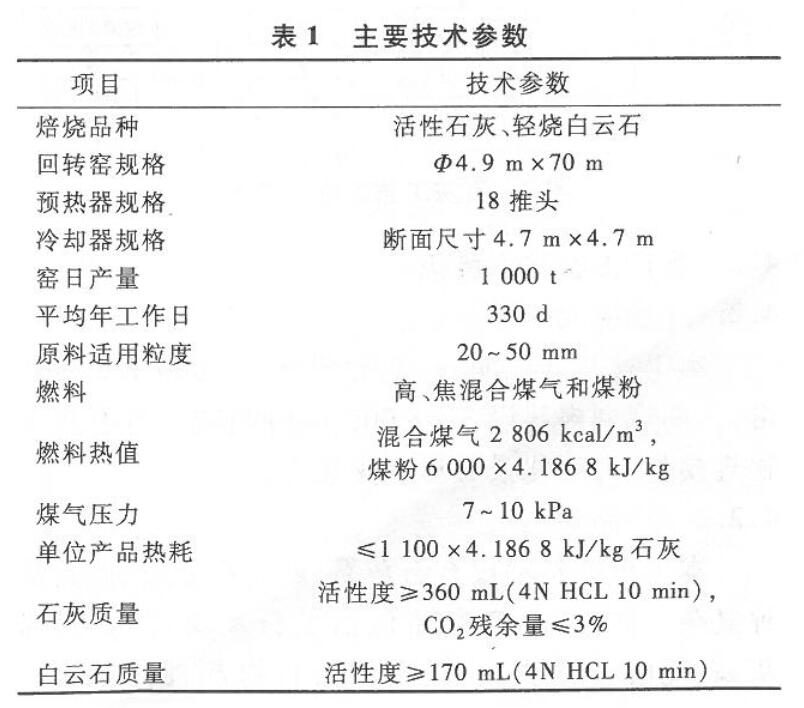 石灰石/白云石進(jìn)人預(yù)熱器后經(jīng)窯尾約1100 ℃的煙氣預(yù)熱,其中一部分石灰石/白云石在預(yù)熱器中分解。預(yù)熱的物料由液壓推桿推出,經(jīng)轉(zhuǎn)運(yùn)溜槽進(jìn)入回轉(zhuǎn)窯中,物料在回轉(zhuǎn)窯內(nèi)經(jīng)過焙燒分解,焙燒好的石灰/白云石進(jìn)入豎式冷卻器,由底部送入的冷空氣冷卻后通過振動(dòng)給料機(jī)排至集料斗,再經(jīng)成品鏈斗機(jī)送往成品系統(tǒng)。冷空氣在冷卻器內(nèi)冷卻物料的同時(shí)被加熱,經(jīng)窯頭罩進(jìn)入窯內(nèi),作為燃料燃燒的二次空氣參與燃燒?;剞D(zhuǎn)窯所用燃料經(jīng)由煤氣和煤粉管道分別送至回轉(zhuǎn)窯窯頭廠房,通過燒嘴從窯頭進(jìn)入回轉(zhuǎn)窯內(nèi)燃燒。燃料燃燒產(chǎn)生的熱煙氣在焙燒和加熱物料后與物料分解產(chǎn)生的廢氣一起從窯尾排出,經(jīng)轉(zhuǎn)運(yùn)溜槽進(jìn)入預(yù)熱器中預(yù)熱石灰石/白云石。預(yù)熱石灰石/白云石后的煙氣從預(yù)熱器排出,經(jīng)過除塵器除塵后由排煙機(jī)排入大氣。主要技術(shù)參數(shù)列于表1。