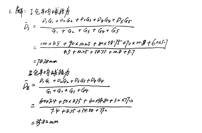 1、φ4.2*12m磨機(jī)鋼球級(jí)配方案是Ⅰ倉:φ100mm的4.5t,φ90mm的10.25t,直徑80mm的38.75t,φ70mm的20.80t,φ60mm的5.70t;Ⅱ倉:φ60mm的7.40t,φ50mm的8.75t,φ40mm的34.80t,φ30mm的77.0t,求Ⅰ、Ⅱ倉的平均球徑。