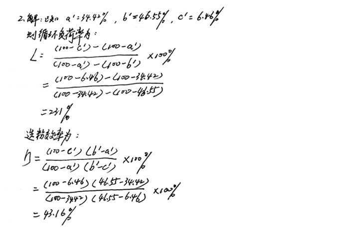 2、磨機(jī)正常運(yùn)轉(zhuǎn)后,分別在出磨斜槽、粗粉斜槽及細(xì)粉斜槽各取5個(gè)樣,其0.08mm篩孔平均篩余分別是34.42%,46.55%,6.46%,求其循環(huán)負(fù)荷率和選粉效率。