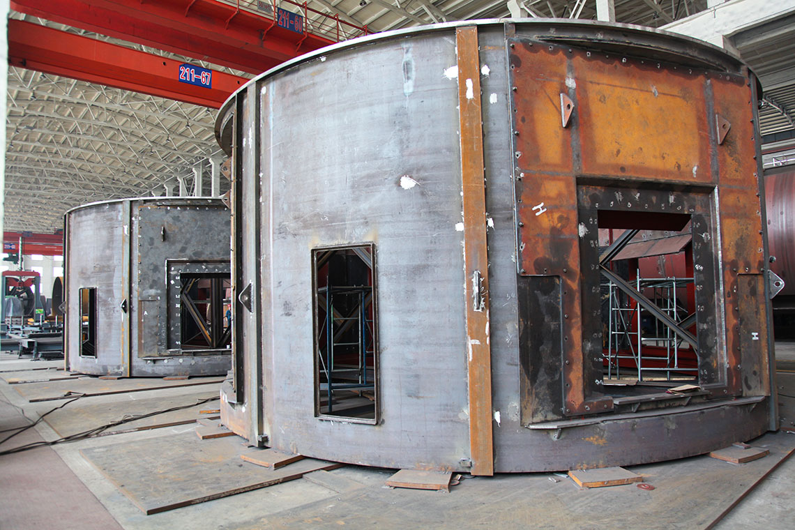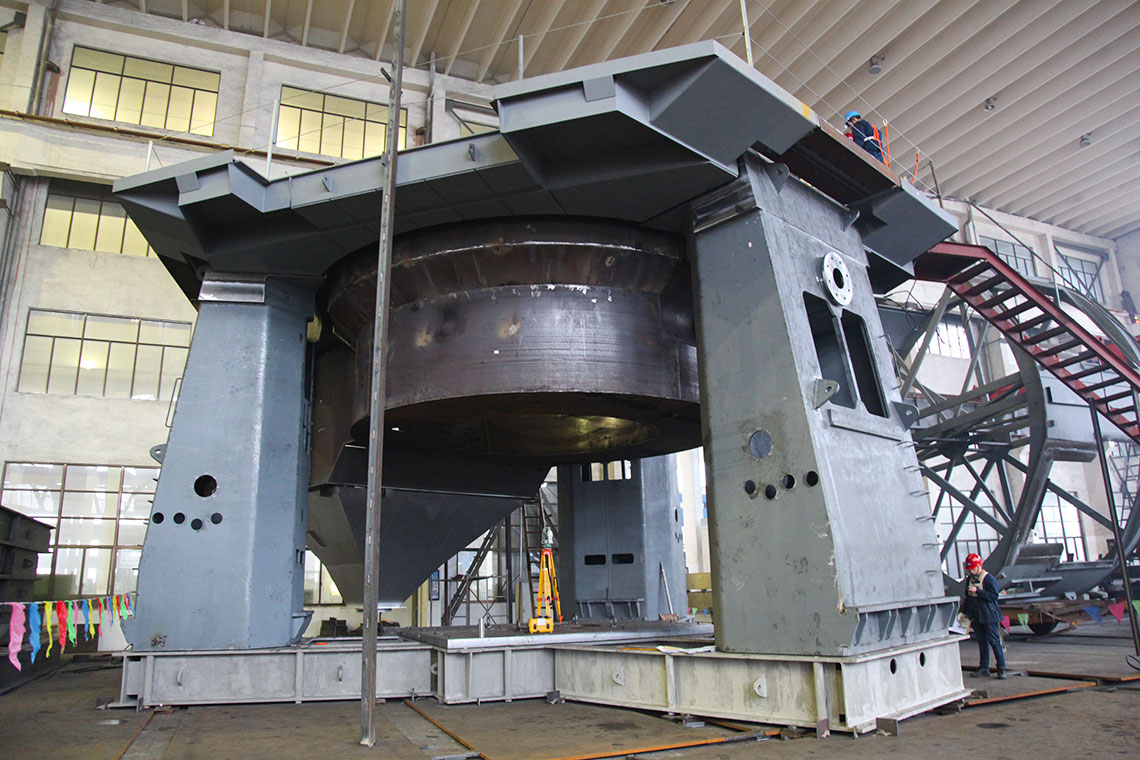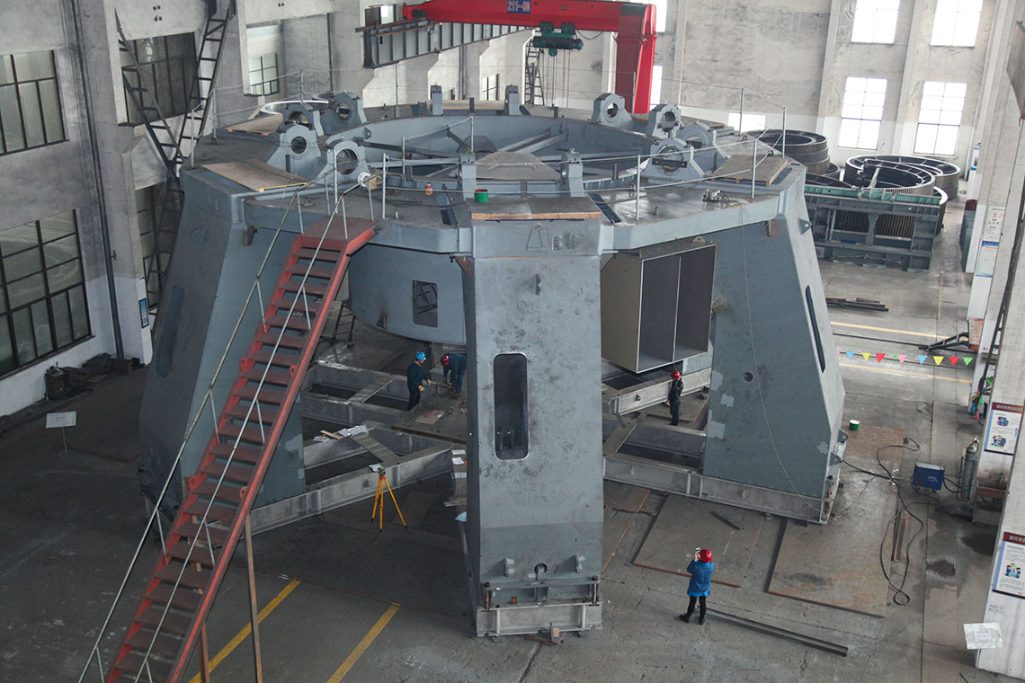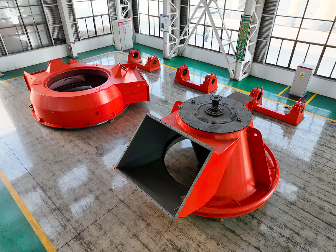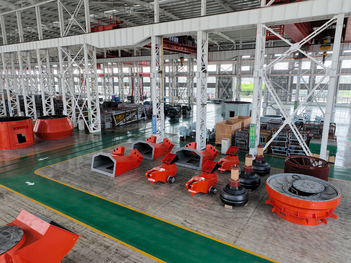 磨煤機(jī)三個(gè)磨輥由旋轉(zhuǎn)的磨盤帶動(dòng)進(jìn)行碾磨作業(yè)。入磨物料經(jīng)中心落煤管落在磨盤上后,由旋轉(zhuǎn)磨盤產(chǎn)生的離心力將其輸送至碾磨輥道上碾磨。碾磨壓力由彈簧或液壓加壓裝置產(chǎn)生,通過靜定的三點(diǎn)系統(tǒng),碾磨力均勻地傳至三個(gè)磨輥,通過加壓系統(tǒng)壓力傳至基礎(chǔ)。煤粉的干燥和輸送利用熱風(fēng)來進(jìn)行。熱風(fēng)通過噴嘴環(huán)均勻分布于磨盤四周,將經(jīng)碾磨的物料干燥并輸送至磨機(jī)上部的分離器。物料的粗細(xì)粉在此分離,細(xì)粉排出磨機(jī),粗粉重新返回磨內(nèi)碾磨。物料中的一些不可破碎物可通過磨機(jī)下部的排碴口排出。磨煤機(jī)主要由基礎(chǔ)部,減速機(jī),下架機(jī),中架機(jī),磨盤,磨輥,加壓裝置,分離器,正壓風(fēng)密封裝置,蒸汽吹掃裝置等部件組成,還配有主電動(dòng)機(jī),潤(rùn)滑油站,液壓站和密封風(fēng)機(jī)等附屬設(shè)備,另備有慢速傳動(dòng)裝置,安裝檢修專用工具,扶梯平臺(tái),煤粉分配器,速斷閥等配套設(shè)備供用戶選用。磨煤機(jī)采用液壓加壓系統(tǒng),在運(yùn)行中即可對(duì)粉磨壓力進(jìn)行調(diào)整,并具有更好的過鐵保護(hù)性能。在原標(biāo)準(zhǔn)型的基礎(chǔ)上增加了磨輥翻出裝置,并提高了磨體的抗爆能力。